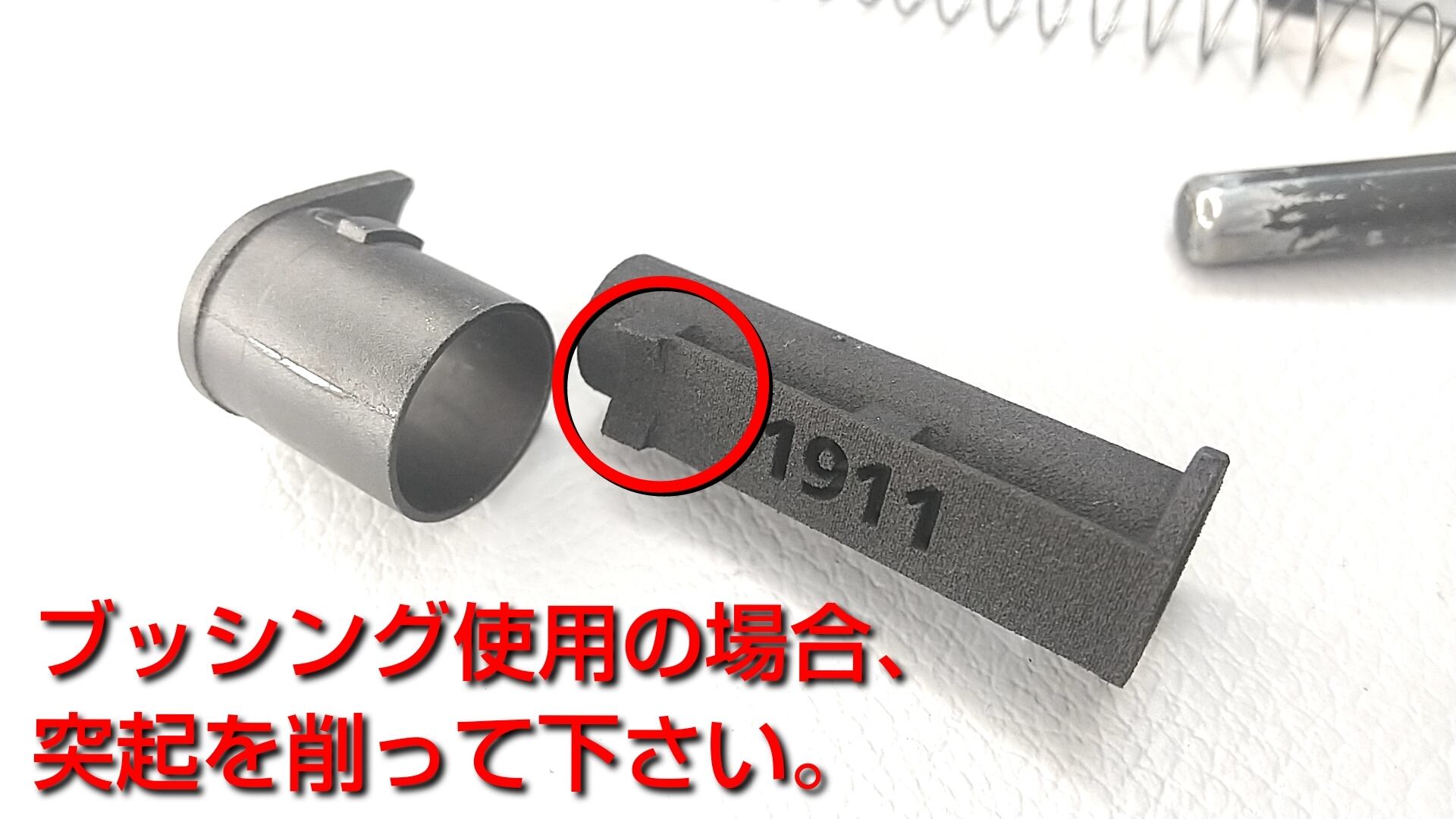 先端形状はハイキャパ系のようなコーンドアウターバレル対応のぶれ止め突起がありますので、ノーマルのバレルブッシングを使用する場合は削ってお使い下さい。