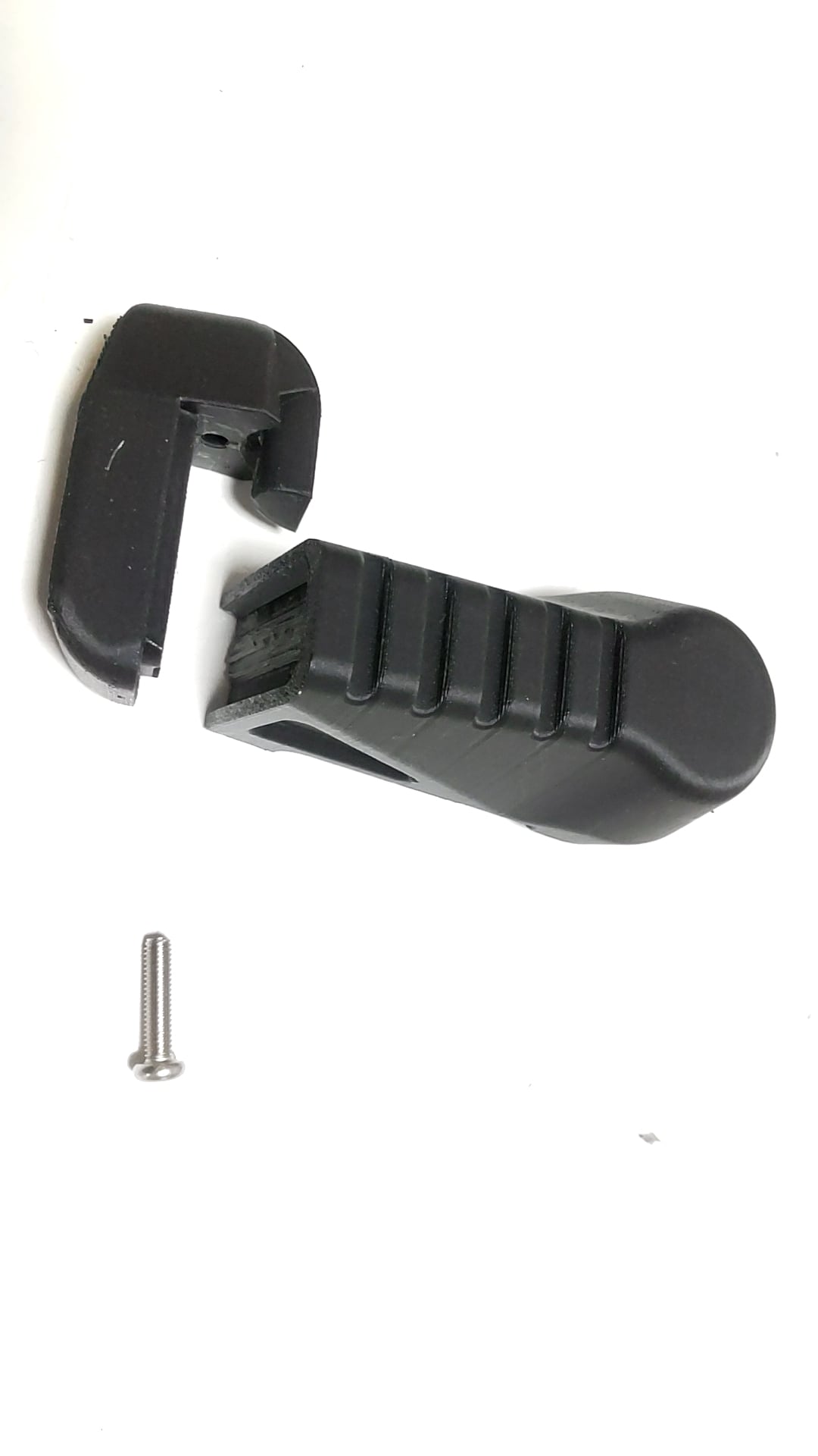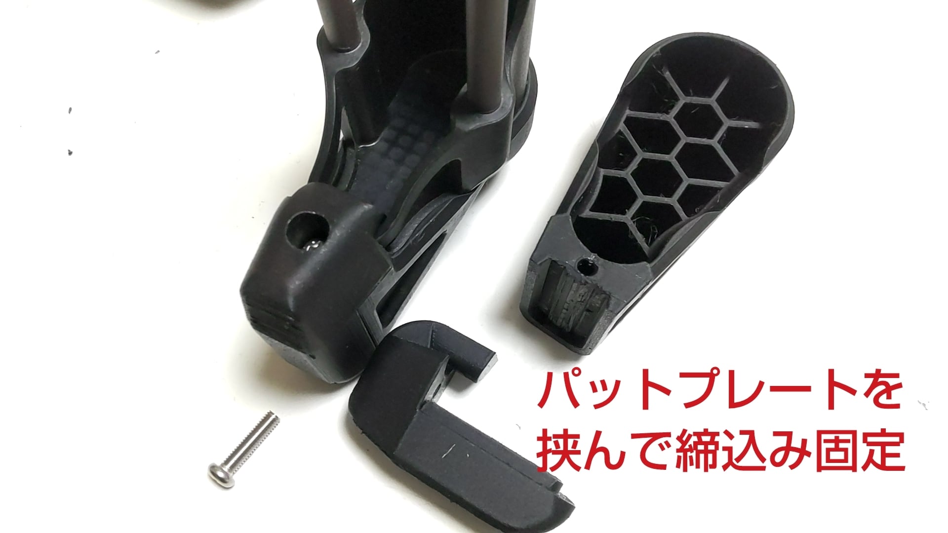 前後分割のパーツを、ストックのパットプレート本体を挟む形でネジ固定するので、本体への穴あけや接着などをせずに取り付けが出来ます。